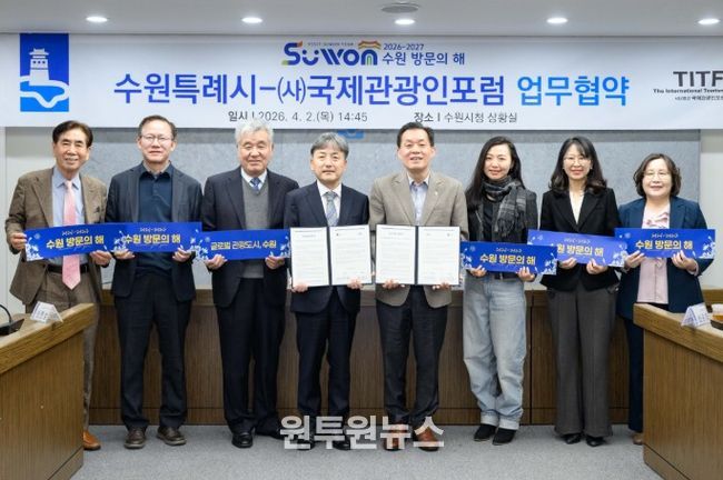 수원시와 (사)국제관광인포럼은 2일 시청 상황실에서 업무협약을 체결하고, ‘제5회 세계관광산업콘퍼런스 개최(6월 5일~6일)’와 ‘2026~2027 수원 방문의 해’의 성공적인 추진을 위해 협력하기로 했다.