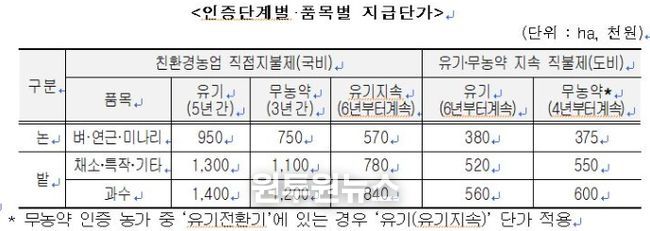 무농약은 3년(3회), 유기는 5년(5회) 인증단계별·품목별 지급단가는 ha당 유기농은 95만원~140만원, 무농약은 75~120만원으로 지급된다. 또한 저농약 지급 이력은 제외하여 친환경 인증 농가의 직불금 수혜 기회를 확대했다.