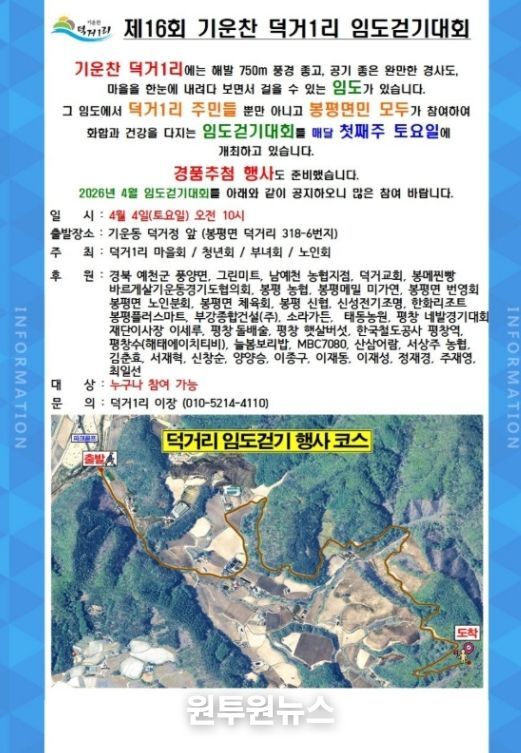 (원투원뉴스) 평창군 봉평면 덕거1리(이장 안현태)에서 지역 주민과 방문객이 함께하는'제16회 기운찬 덕거리 임도걷기대회'가 오는 4월 4일 개최된다.