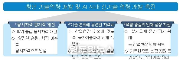 고용노동부는 전문가들의 제언을 토대로 청년층 기회 확대를 위해 올해부터 국가기술자격 응시자격 등 제도 개선을 추진한다. 첫째, 기술사·기능장 등급 시험 응시를 위한 경력 기간을 합리적으로 조정한다. 현재 기술사·기능장 시험에 응시하기 위해서는 최대 9년의 경력이 요구되어 평균 44.8세에 기술사를 취득하는 등 고령화가 심화되고 있다. 이에, 더 많은 청년층이 신속히 기술사·기능장 등급에 진입할 수 있도록 경력 기간을 현행 대비 2~4년씩 단축한다.