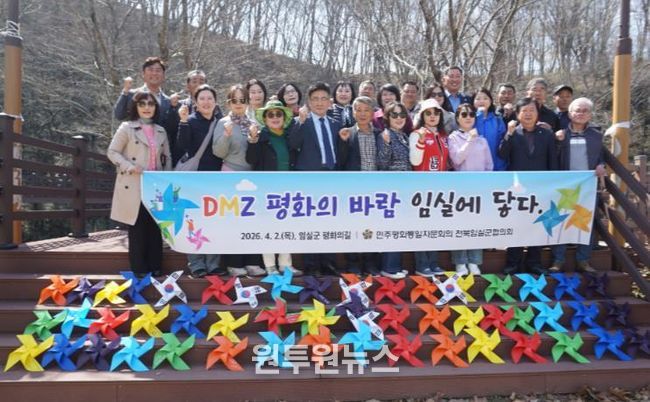 (원투원뉴스) 민주평화통일자문회의 임실군협의회는 지난 2일, 임실군 사선대 국민관광지에서 자문위원 30여 명이 참석한 가운데 ‘DMZ에서 고이 담아 온 평화의 바람(HOPE)’을 상징하는 바람개비를 설치하여 ‘함께걷는 평화의 바람길’을 조성했다.