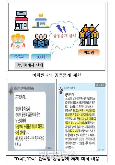 이 단톡방에“공멸하지 않으려면 비회원을 축소·위축시켜야 합니다.”, “D회 총회 결과 공인중개사와 ◇◇공인중개사 2곳에 대해 6개월간 회원자격을 정지합니다.”라는 등 비회원과 공동중개한 회원들을 제재했다.
