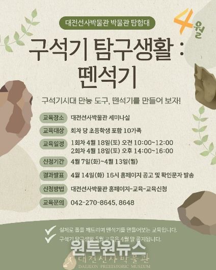 (원투원뉴스) 대전선사박물관은 4월 18일 오전과 오후 두 차례에 걸쳐 가족 대상 교육 프로그램 ‘구석기 탐구생활’을 운영한다.
