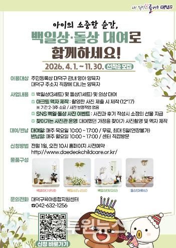 대덕구 관계자는 “백일과 돌은 아이의 성장을 기념하는 뜻깊은 순간인 만큼, 이번 사업이 가족에게 소중한 추억을 선물하는 데 도움이 되길 바란다”며 “앞으로도 아이 키우기 좋은 대덕구 조성을 위해 다양한 지원사업을 지속적으로 추진하겠다”고 말했다.