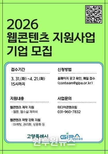 (원투원뉴스) 고양특례시와 고양산업진흥원이 오는 21일까지‘웹콘텐츠 지원사업’ 참여기업을 모집한다.
