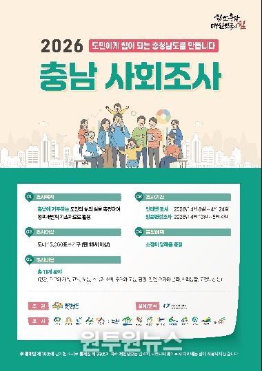 (원투원뉴스) 충남도는 오는 8일부터 5월 4일까지 도내 1만 5000가구를 대상으로 ‘2026 충남 사회조사’를 실시한다고 7일 밝혔다.