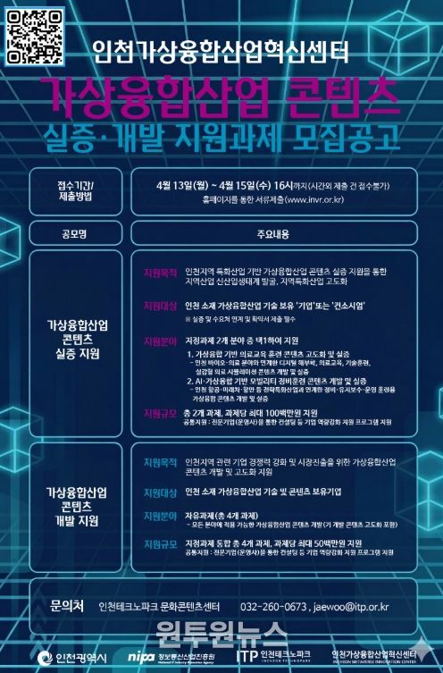 신청은 4월 15일 오후 4시까지 인천 가상융합산업 혁신센터 누리집 을 통해 온라인으로 접수하면 된다.