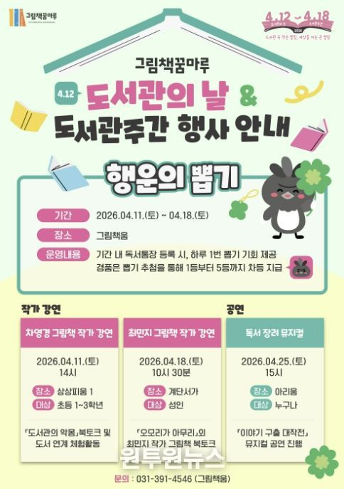 도서관 주간(4월 11일~18일) 동안 그림책꿈마루에서는 ▲작가와의 만남 ▲행운의 뽑기 ▲독서 장려 뮤지컬 공연과 같이 다양한 프로그램이 진행된다.