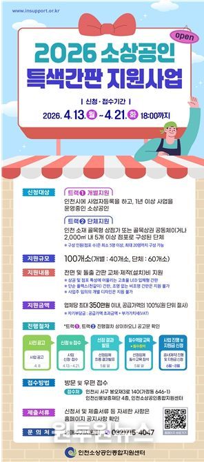 신청을 희망하는 개인 또는 단체는 2026년 4월 13일부터 4월 21일 오후 6시까지 우편 또는 방문 신청할 수 있으며, 자세한 사항은 인천소상공인종합지원포털 또는 인천소상공인종합지원센터 누리집에서 확인할 수 있다.