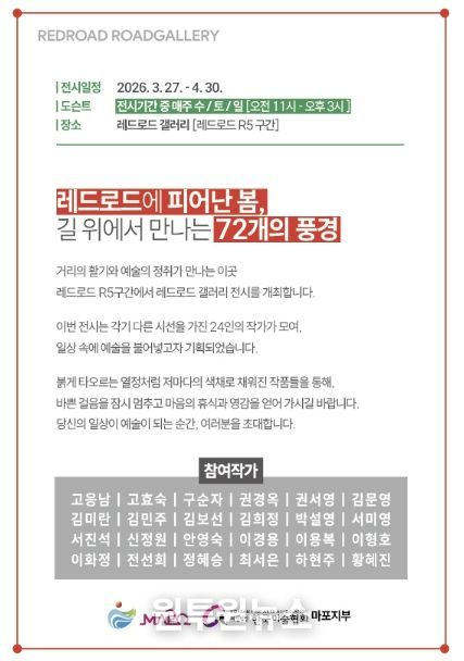 (원투원뉴스) 마포구는 레드로드 R5 구간 ‘로드갤러리’를 새롭게 단장하고, 4월 30일까지 봄맞이 전시를 운영한다.