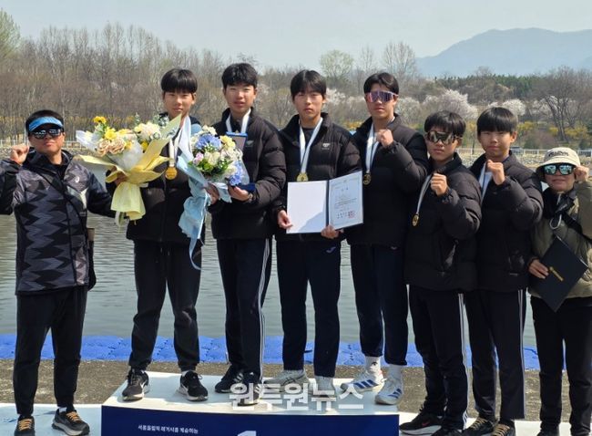 특히 지난해 5월 전국소년체육대회에서 K-2(500M), K-4(500M) 2관왕을 달성했던 정승호(3학년) 선수는 이번 대회에서 K-1(200M, 500M), K-2(200M, 500M), K-4(200M) 등 5개 부문에서 금메달을 휩쓸며 5관왕을 달성하고 대회 최우수 선수로 선정됐다.