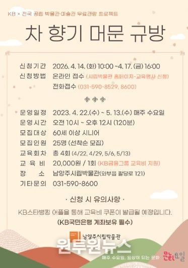 (원투원뉴스) 남양주시는 오는 22일부터 남양주시립박물관이 시니어 대상 체험 프로그램 ‘차 향기 머문 규방’ 운영하고, 이에 앞서 14일부터 참여 신청을 받는다고 7일 밝혔다.