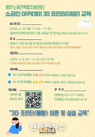 1회차 교육은 4월 23일 동탄 소공인복합지원센터에서 운영되며, ▲3D 프린터(메탈) ▲ 매직스 및 전처리 등의 주제로 이론과 실습을 병행해 수강생들의 현업 적용을 지원할 예정이다.