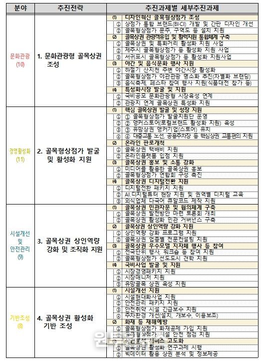4대 전략과 38개 세부과제를 축으로, 3년간 총 212억 원 규모의 예산을 투입할 계획이다. 4대 전략은 ▲문화관광형 골목상권 조성 ▲골목형상점가 발굴 및 활성화 지원 ▲상인 역량 강화 및 조직화 지원 ▲골목상권 활성화 기반 조성으로 구성된다.