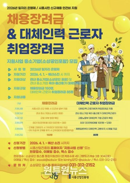 (원투원뉴스) 시흥시는 관내 중소기업의 신규 채용을 촉진하고 안정적인 고용 창출을 위해 ‘2026년 일자리 은행제’ 사업 참여자 모집을 4월 1일부터 시작한 가운데 예산 소진 시까지 진행한다.