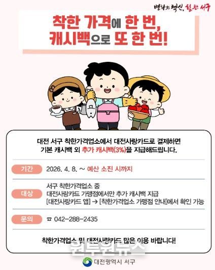 (원투원뉴스) 대전 서구는 고물가 속 저렴한 가격을 유지하며 지역 물가 안정에 기여하는 ‘착한가격업소’ 이용 활성화를 위한 캐시백 지원 사업을 시행한다고 8일 밝혔다.