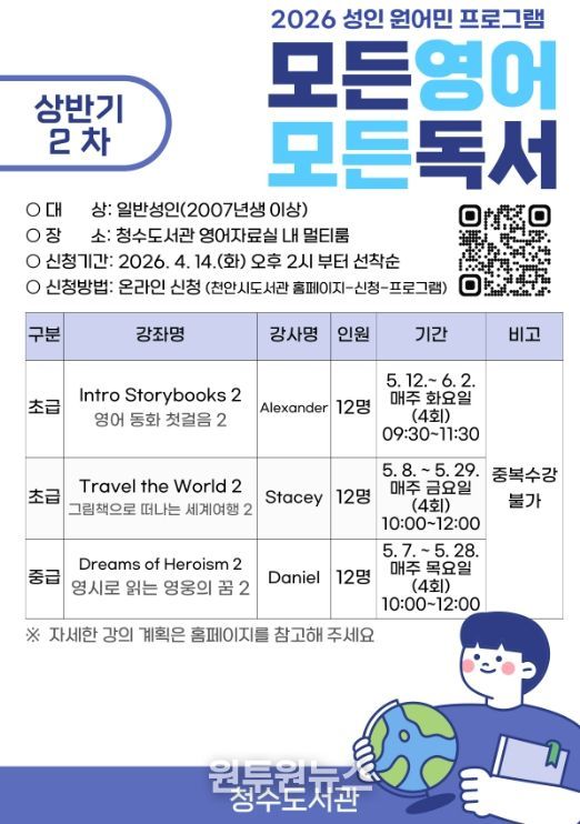 (원투원뉴스) 천안시 청수도서관은 내달부터 원어민 영어 독서프로그램 ‘모든 영어 모든 독서’ 수강생을 모집한다고 9일 밝혔다.