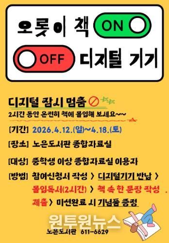 (원투원뉴스) 대전 유성구는 오는 12일부터 18일까지 도서관 주간을 맞아 노은도서관에서 ‘마음쓰임 프로젝트2:오롯이 책 ON, 디지털 OFF’ 독서 프로그램을 운영한다.