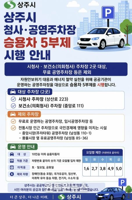 이번 민간부문 승용차 5부제는 공공기관이 운영하는 유료주차장이 대상이며, 상주시 해당 주차장은 △시청사 부설주차장(상산로 223)과 △보건소(의회청사) 부설주차장(중앙로 111) 2곳이다. 무료로 운영하는 공영주차장과 임시공영주차장 등은 시행 대상에서 제외된다.