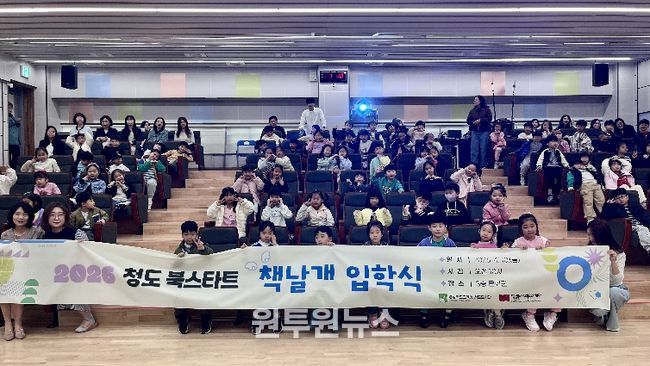 (원투원뉴스) 경상북도교육청 청도도서관(관장 조은희)은 4월 10일 청도도서관 문화관에서 관내 초등학교 9개교 1학년 학생 80여 명을 대상으로 2026년 청도 북스타트 책날개 입학식을 개최했다.