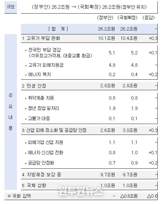 국회 심의 과정에서 투자 여력이 남아 있는 정책펀드·융자, 보증기관 출연 등 △0.6조원을 감액하고, 대중교통 이용 활성화를 위한 모두의 카드(기존 K-패스) 반값 할인, 국제 정세 불안정성에 따른 나프타 수급 안정, 고유가에 따른 농어민 부담 완화를 위한 농기계 유가연동보조금 신설 및 어업인 면세경유 유가연동보조금 한도 상향, 무기질 비료 지원 확대 등 총 0.6조원을 증액했다. 감액 범위 내 증액을 통하여 추경예산 규모는 정부안의 26.2조원 수준을 유지했다.