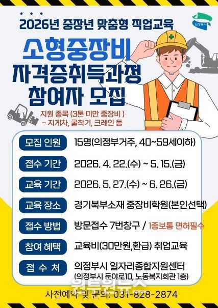 (원투원뉴스) 의정부시는 관내 중장년층 구직자의 재취업을 지원하기 위해 맞춤형 직업교육인 1인 1기술 ‘소형중장비 자격증 취득 과정’ 참여자를 모집한다.