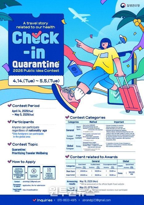 (원투원뉴스) 질병관리청은 건강한 해외여행 문화를 확산하고 여행자 건강 중심 검역에 대한 국민 인식을 높이기 위해 4월 14일부터 5월 5일까지 '체크인, 검역 : 우리가 만드는 여행건강 이야기, 국민 생각 공모전'을 개최한다.