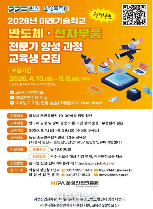 (원투원뉴스) 화성산업진흥원(원장 전병선)에서 지역 기술 인력 양성을 위해 ‘2026년 미래기술학교’를 추진하고 반도체·전자부품 전문가 양성과정 교육생을 모집한다.