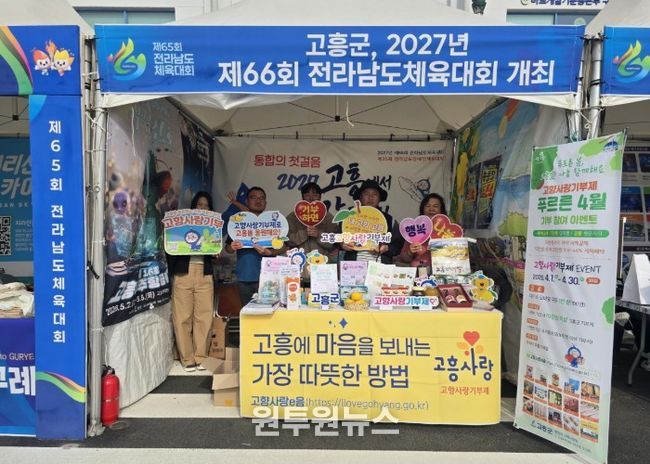(원투원뉴스) 고흥군은 제65회 전라남도체육대회가 열린 구례군 공설운동장에서 고향사랑기부제 홍보부스를 운영하며 기부 참여 확산에 나서, 4월 10일부터 13일까지 4일간 진행된 현장 홍보를 성황리에 마무리했다고 밝혔다.