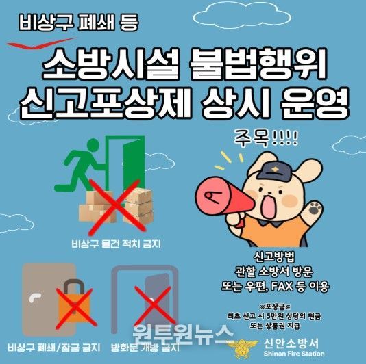 (원투원뉴스) 신안소방서는 화재 예방과 안전문화 확산을 위해 ‘소방시설 불법행위 신고포상제’를 연중 운영하고 있다고 밝혔다.