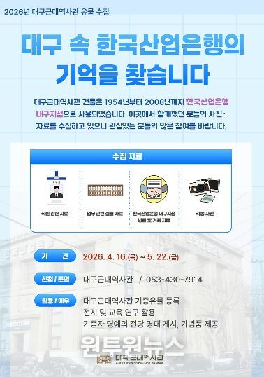 (원투원뉴스) 대구문화예술진흥원 박물관운영본부 소속 대구근대역사관은 4월부터 5월 중순까지 한국산업은행 관련 자료를 수집하는 기증 운동을 전개한다.