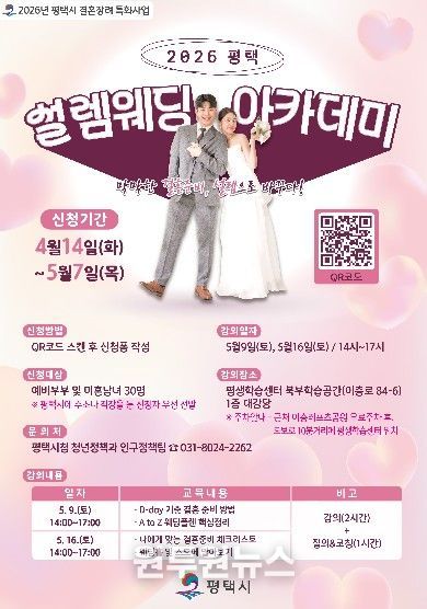 (원투원뉴스) 평택시는 2026년 평택시 결혼 장려 특화사업 ‘2026 평택 설렘웨딩 아카데미’를 오는 5월 9일과 16일에 운영한다고 밝혔다.