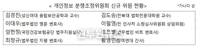(원투원뉴스) 개인정보보호위원회는 개인정보 분쟁조정위원회(위원장 강영수, 이하 ‘분쟁조정위’)의 위원 8명을 신규 위촉했다. 위촉기간은 ’26. 4. 15.부터 ’28. 4. 14.까지 2년간이다.
