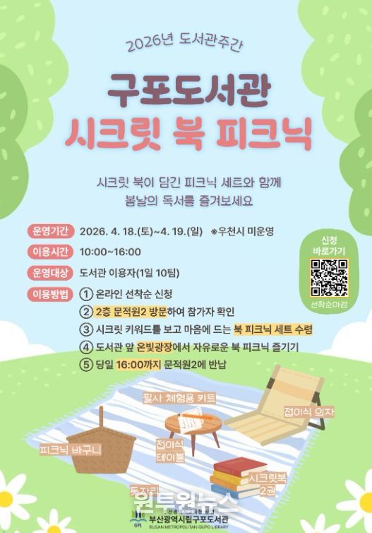 (원투원뉴스) 부산광역시립구포도서관은 도서관 주간을 맞아 오는 18일과 19일 이틀간 도서관 앞 온빛광장에서 도서관 이용자를 대상으로 이색 대출 서비스 ‘시크릿 북 피크닉’을 운영한다.