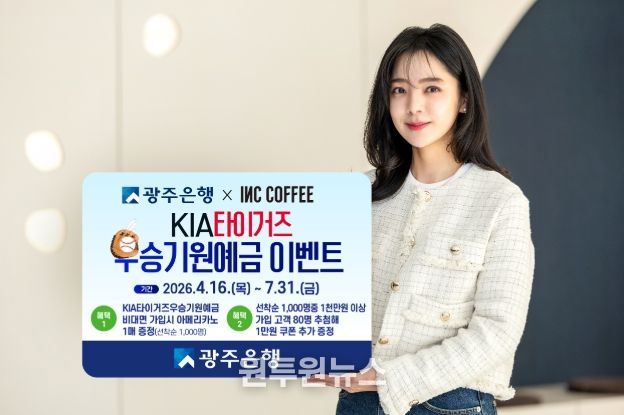 (원투원뉴스) 광주은행은 4월 16일부터 7월 31일까지 인크커피(INC COFFEE)와 협업해 비대면 가입 고객을 대상으로 다양한 혜택을 제공하는 ‘광주은행X인크커피 KIA타이거즈우승기원예금 이벤트’를 실시한다고 밝혔다.