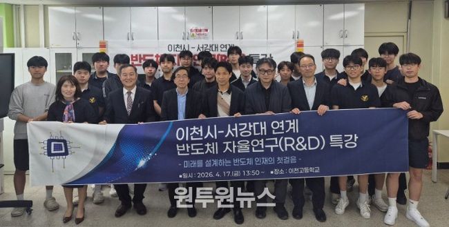 (원투원뉴스) 경기도이천교육지원청은 2026년 '서강대학교 연계 반도체 프론티어 자율연구 프로그램'의 시작으로 4월 17일 이천고등학교 화학실에서 반도체 산업·기술·진로 특강을 운영했다.