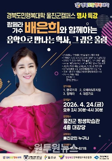 (원투원뉴스) 울진군은 오는 4월 24일 울진군 평생학습관에서 ’경북도민행복대학 울진군캠퍼스 명사특강‘ 을 개최한다.