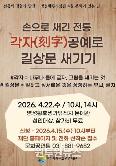 (원투원뉴스) 여주세종문화관광재단은 오는 4월 22일, 명성황후기념관 4월 문화가 있는 날 프로그램으로 '손으로 새긴 전통, 각자(刻字)공예로 길상문 새기기'를 진행한다.