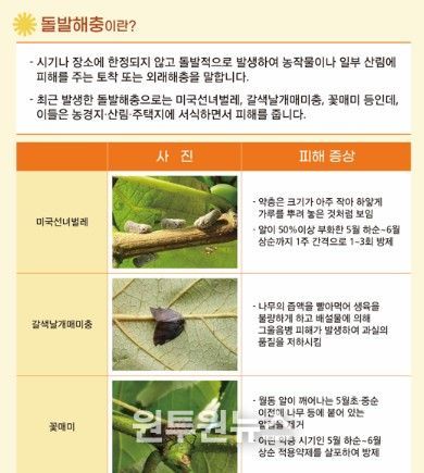 대표적인 돌발 해충으로는 갈색날개매미충, 꽃매미, 미국선녀벌레 등이 있으며, 피해를 최소화하고 확산 방지를 위해 복숭아, 배, 사과, 포도 등 면적 792ha, 1,429호의 농가에 적용 약제를 공급한다.