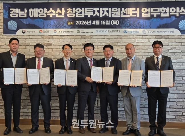 (원투원뉴스) 경상국립대학교 해양과학대학은 경상남도 해양수산 창업투자 활성화를 위해 4월 16일 경남테크노파그에서 경상남도, 경남테크노파크, 경남항노화연구원, 수협중앙회 경남본부, 경상남도 청년어업인연합회 등과 업무협약(MOU)을 체결했다.