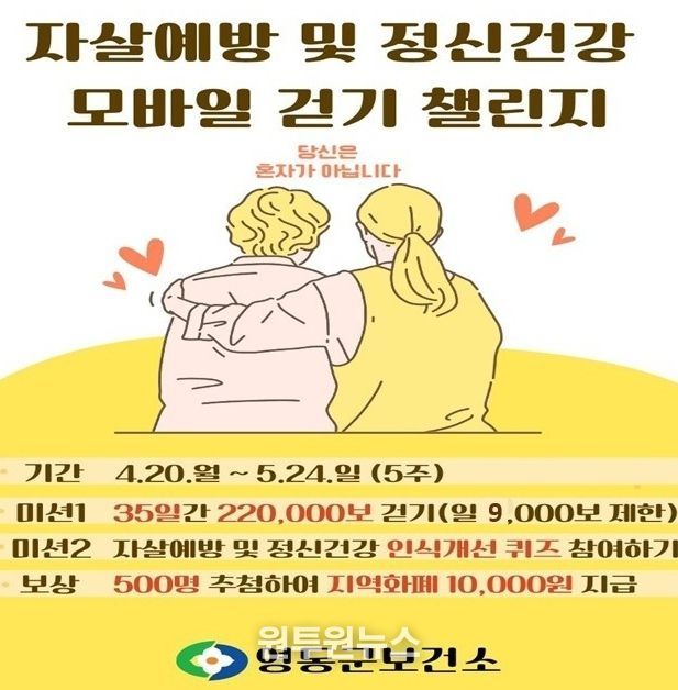 (원투원뉴스) 충북 영동군보건소는 군민의 정신건강 증진과 자살예방 인식 확산을 위해 ‘자살예방 및 정신건강 인식개선 모바일 걷기 챌린지’를 운영한다고 밝혔다.