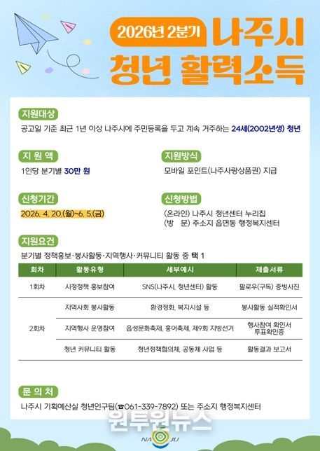 (원투원뉴스) 전남 나주시가 지역 청년의 사회참여 확대와 안정적 정착을 지원하기 위해 공공활동 참여를 조건으로 분기별 30만 원을 지급하는 ‘청년 활력소득 지원사업’ 2분기 참여자 모집에 나선다.