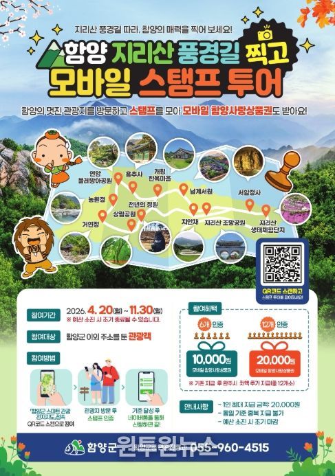 (원투원뉴스) 함양군은 함양의 대표 관광자원을 보다 쉽고 재미있게 즐길 수 있도록, 관광객 참여형 이벤트인 ‘함양 지리산 풍경길 찍고 모바일 스탬프 투어’를 운영한다고 밝혔다.