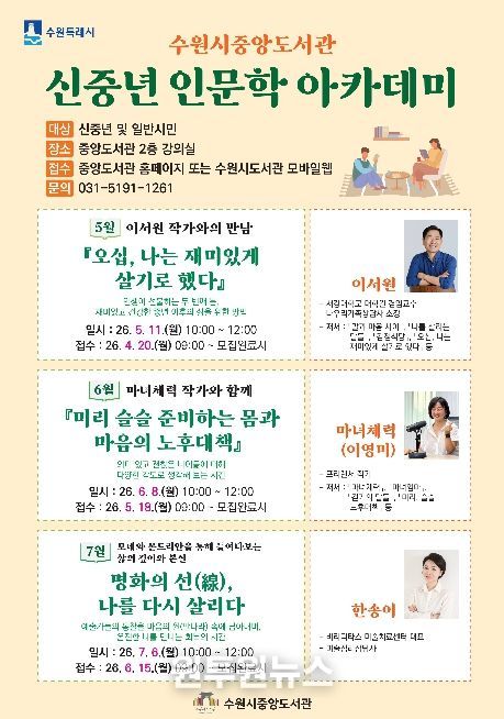 (원투원뉴스) 수원시 중앙도서관이 5월부터 7월까지 매달 1회 운영하는 ‘신중년 인문학 아카데미’ 수강생을 모집한다.