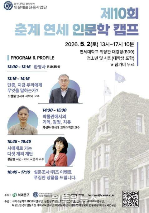 (원투원뉴스) 서대문구가 연세대학교 문과대학과 공동으로 5월 2일 오후 1시부터 5시 10분까지 연세대 위당관 대강당(B09호)에서 ‘제10회 연세 인문학 캠프’를 개최한다.