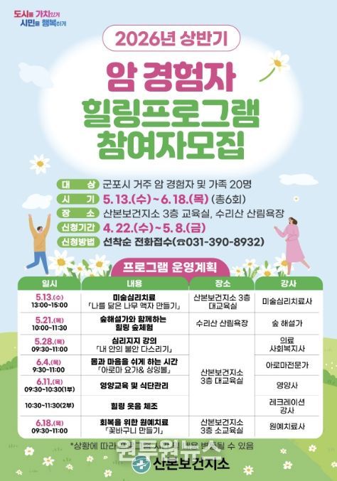 (원투원뉴스) 군포시 산본보건지소는 오는 5월 13일부터 6월 18일까지 총 6회에 걸쳐 암 경험자와 그 가족 20여 명을 대상으로 암 경험자 자조모임인 ‘봄·봄·봄 프로그램’을 운영한다.