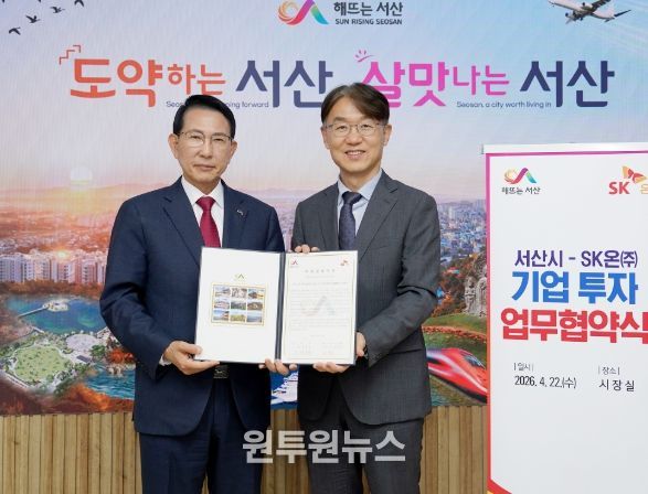시는 22일 시청 시장실에서 이완섭 서산시장, 피승호 SK온㈜ 총괄 부사장이 참석한 가운데 협약식을 개최했다.