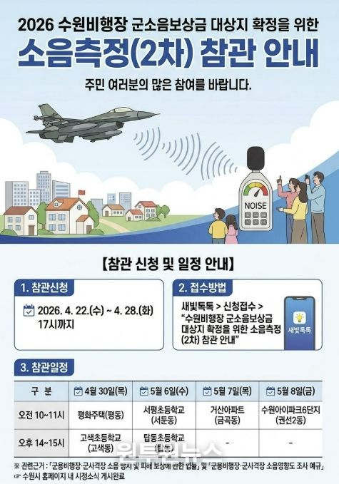 (원투원뉴스) 수원특례시가 수원비행장 인근 주민들의 소음 피해 보상 근거가 될 국방부의 ‘수원비행장 소음 영향도 조사 2차 소음측정’ 주민 참관 참여자를 모집한다. 4월 28일까지 새빛톡톡으로 신청할 수 있다.