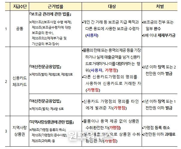 또한, 지역별 ‘부정유통 신고센터’를 운영하여 가맹점을 수시 단속하고 온라인 커뮤니티 등에서 개인 간 거래가 발생하지 않도록 모니터링을 강화해 줄 것을 각 지방정부에 요청했다.
