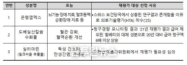 개편 평가체계에 따라 2026년도 평가 대상으로 은행엽엑스, 도베실산칼슘수화물, 실리마린(밀크씨슬 추출물) 총 3개 성분이 선정됐으며, 구체적 선정 사유는 아래와 같다.